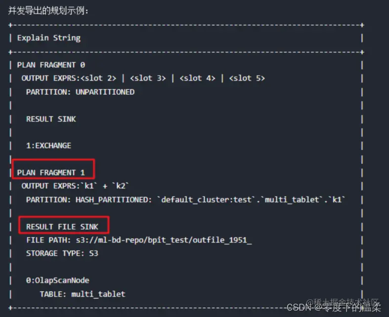 对查询进行explain后,Doris会返回该查询的规划,如果发现RESULT FILE SINK出现在PLAN FRAGMENT 1中,就说明导出并发开启成功了。如果RESULT FILE SINK出现在PLAN FRAGMENT 0中,则说明当前查询不能进行并发导出(当前查询不同时满足并发导出的三个条件)。
