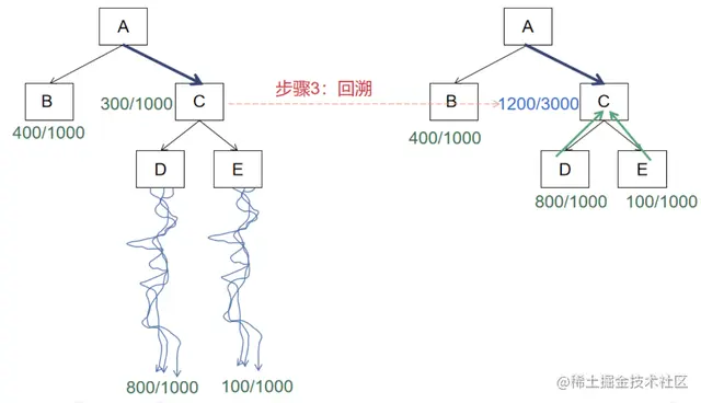 在评估完D和E后,可以更新C的评估值(如下图,步骤3),使它更准确,下图中蓝色字体1200/3000表示局面C的新评估值,由原先C的评估值、D和E的评估值叠加而成。