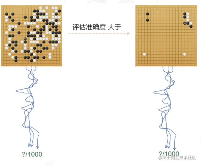 原理二: 越是后面的局面,评估越准。如下图所示,左图是下了很长时间的棋局,右图是开始不久的棋局,假如都模拟1000次,左图的评估准确度会大于右图。这很直观,越到后面,棋局态势就越明晰。同时,由于快要分出胜负,模拟棋局所需的走子次数更少,计算量少就意味着可以模拟更多次数。