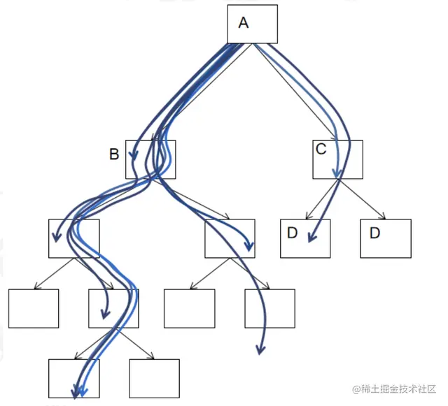 如此往复,根据已得到的评估值来选取子局面。若遇到尚未扩展的局面时,则扩展它的子局面。最终程序会走出如下图所示的路径,估值高的节点会评估更多次数(原理一),有些路径会走的很深(原理二)。在走出约1000条路径后(可接受时间内大概可以计算千次,当然,更多更好),看看局面B和局面C哪个评估值更高,然后下棋。