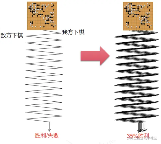 既然很难通过“势力图”去评估局面好坏,那就转为“采样”的思路。如下图(左)所示,从某一个局面开始,让AI随机下棋,直到胜利或者失败。只要下的次数够多,就可以统计从该局面下棋的胜率(下图右),胜率越高,棋局的估值也就越高。有理论证明,只要采样的次数足够多,局面评估的值会趋近于真实值。
