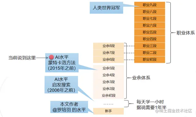 至于业余弱5段是什么水平,可以参考下图。下图展示了围棋各段位水平,职业九段最强,业余5段可以算中等水平吧。