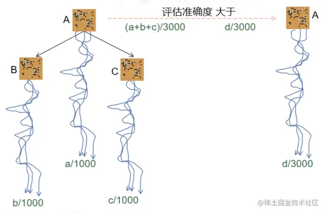 根据这一原理,可以这么认为:如果把某一个节点展开,就算模拟同样的次数,也会比单独的模拟准。如下图所示,假设局面A有B和C两种可能的走法,依然假设算力可以支撑3000盘模拟棋。那么分别对局面A、B、C做1000次模拟,然后相加所得到胜率(下图左),会比单独对局面A做3000次模拟(下图右)更准。因为越后面的局面越准,显然B、C的评估准确度会相对于A准确。下图中,用绿色字体a、b、c表示对局面A、B、C分别模拟1000次后胜利的次数,d表示对局面A模拟3000次后胜率的次数,对于左图,最终胜率由(a+b+c)/3000计算。