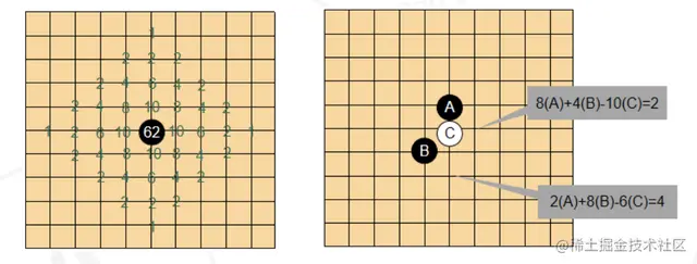 其二,围棋局面变化多端,不像象棋依靠计算剩余棋子的价值就能大概判断局面好坏。围棋局面评估大多基于“势力图”,如下图(左)表示的是一颗棋子的势力范围,距离它近的地方势力大,距离远的地方势力小(如图中数字从10逐渐下降到1)。综合所有棋子即可计算玩家局面好坏,如下图(右)展示的是从黑棋的角度看,棋盘某些点的势力值,综合所有点的势力值即得到局面评分。不过相比象棋,这样的评分规则很不精准。