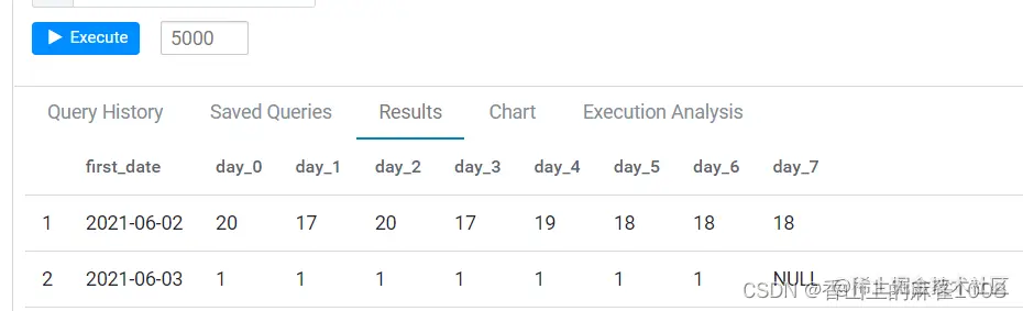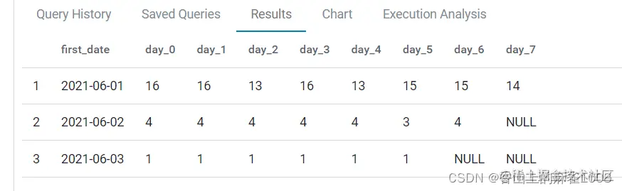 这种计算方式有个好处,在这个结果表上再进一步的运算,可以得到任意个时间段内连续登陆的用户数,及用户明细