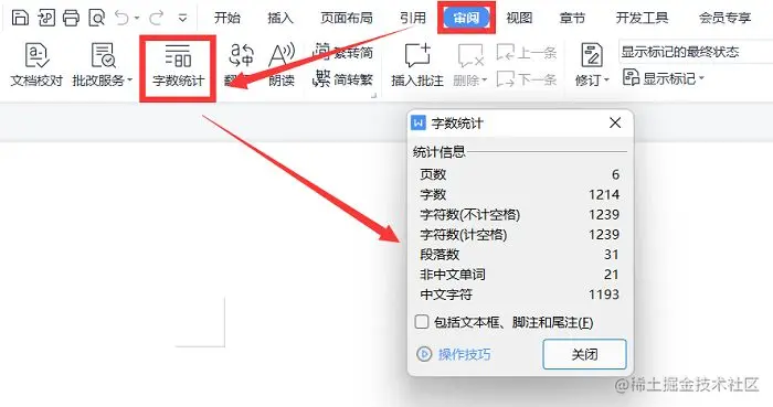 第二种: 在文档上方的工具栏的【审阅】,点击【字数统计】,就能够看到页数、字数、字符数(不计空格)、字符数(计空格)、段落数、非中文单词和中文字符的统计信息。