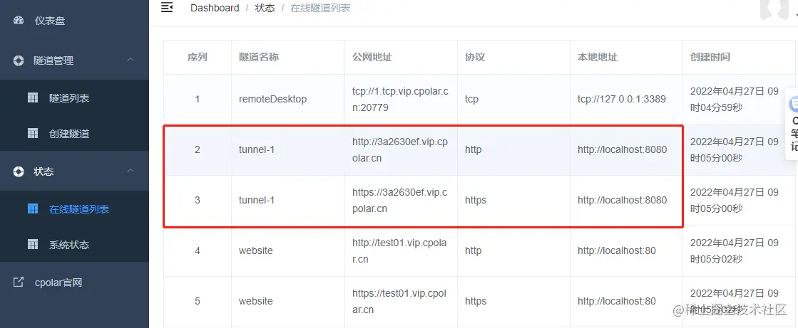 点击创建,隧道创建成功后,会自动跳转到隧道列表,然后点击状态——在线隧道列表,可以查看到刚刚创建隧道的公网地址,复制到浏览器就可以正常在互联网上访问到在本地内网搭建的网站了。