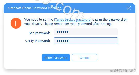 第二步、连接后,您可以单击右角的开始按钮开始扫描iPhone。第三步、您可能需要设置iTunes备份密码来保护备份。