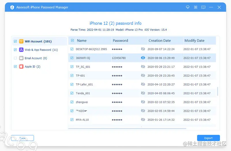 第四步。扫描后,你应该会看到你所有帐户信息和密码的列表。它们将自动按不同类型分类:WiFi帐户、Web&APP、电子邮件帐户、Apple ID、屏幕时间和信用卡。您可以相应地找到任何密码。最后,您甚至可以根据需要选择和导出任何密码。您可以选择导出密码文件进行备份。