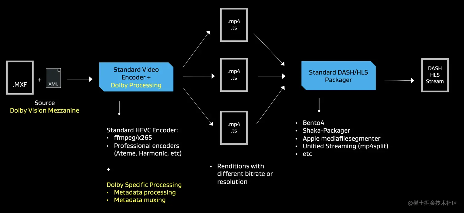 后期制作的故事片和家庭剧集内容通常以夹层格式(如Apple ProRes或Interoperable Master Format(IMF))交付给发行渠道,如OTT服务提供商。 本文是关于将这种Dolby Vision夹层文件编码为Dolby Vision比特流。 如果你正在寻找关于如何将内容编码为Dolby Vision传送到文件共享平台(如Vimeo或BiliBili)的信息,请参考这篇文章 。