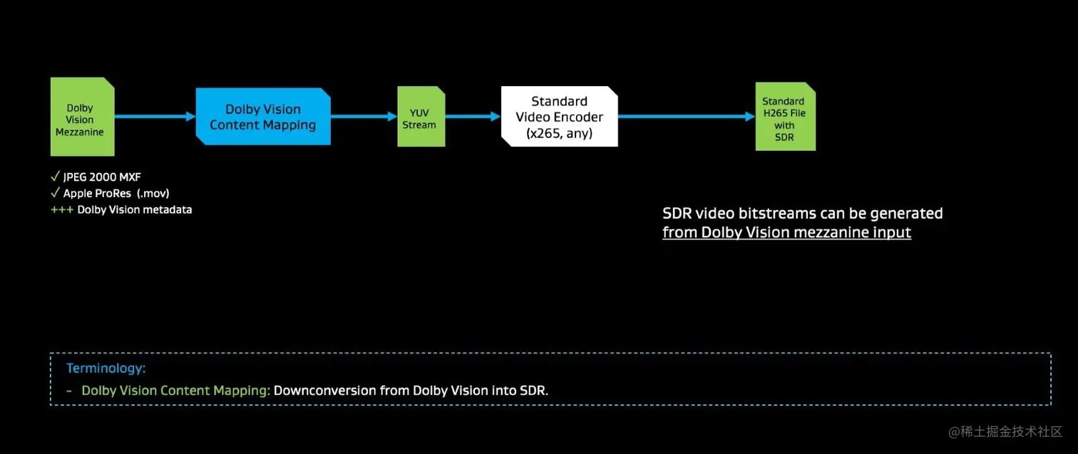 在预处理期间,杜比视界内容映射将使用杜比视界夹层文件中的杜比视界元数据来映射到SDR YUV流,然后使用标准视频编码器进行编码。