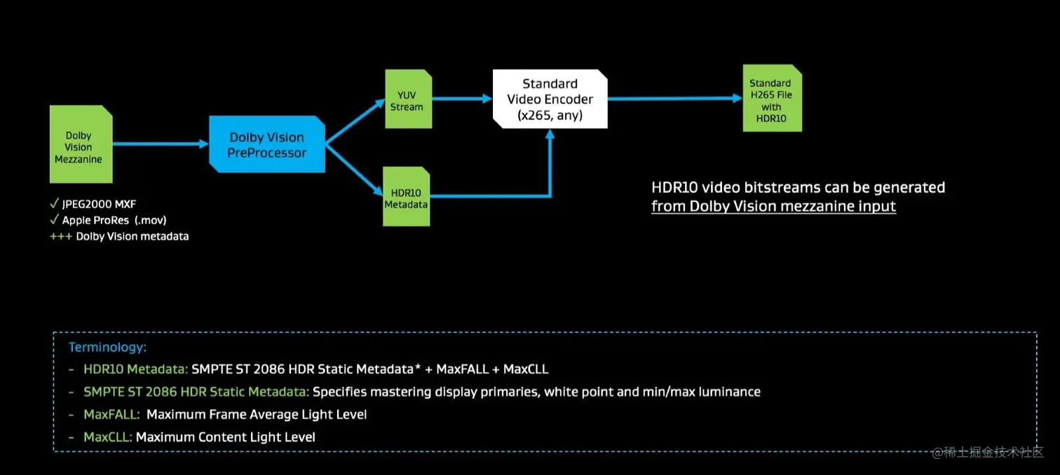 你也可以使用支持Dolby Vision的编码器从Dolby Vision夹层文件生成HDR10比特流。Dolby Vision预处理器将把Dolby Vision视频输出为符合HDR10标准的YUV流,同时将HDR10静态元数据传递给HEVC视频编码器。最终的输出是一个标准的HDR10兼容编码文件。在某些情况下,可能需要将杜比视界内容映射(CM)应用到传入的夹层中,以实现较低的亮度输出。如果需要这种映射,将在Dolby Vision预处理期间完成。