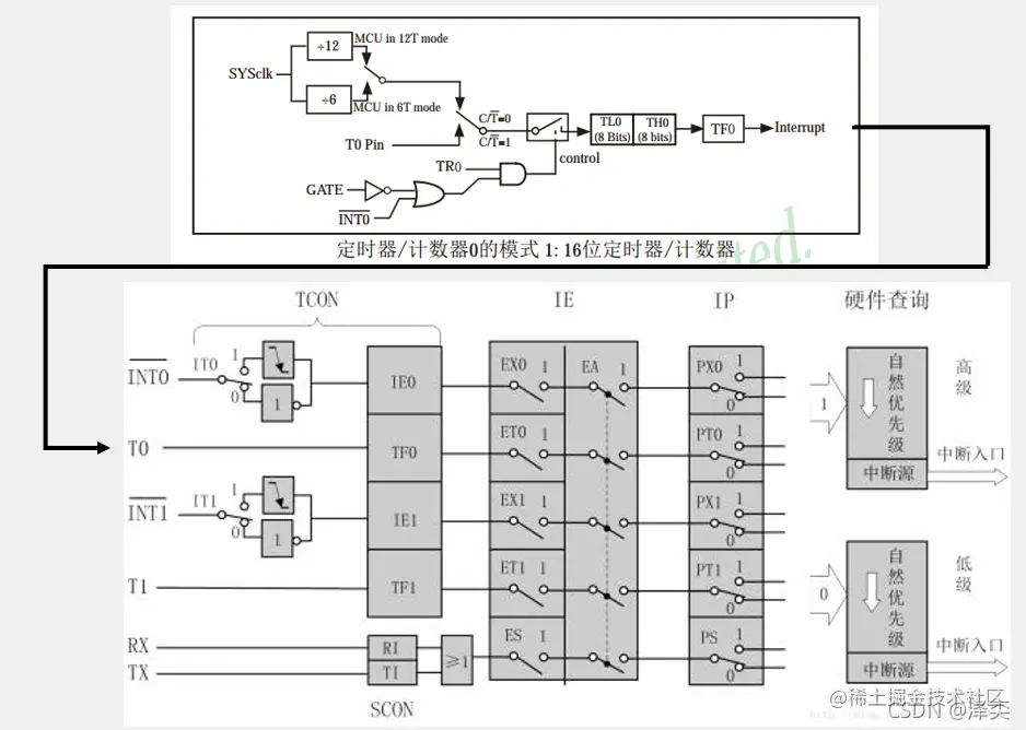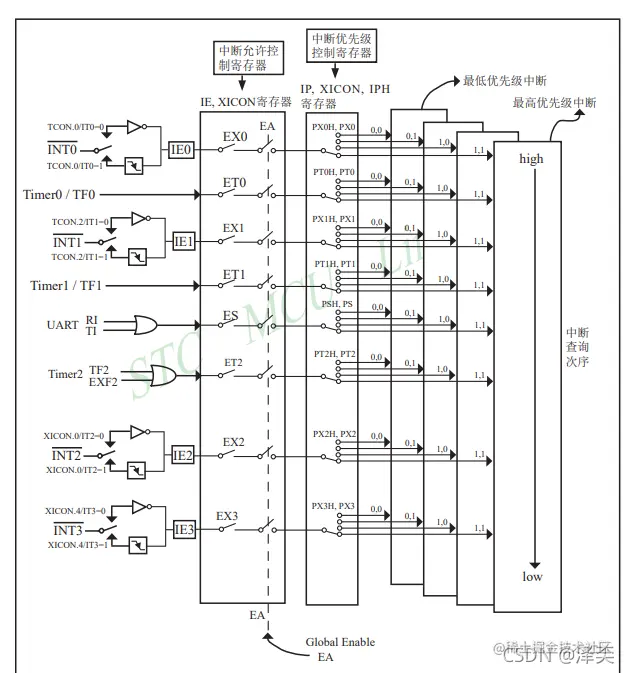注意:这里的中断系统是传统意义上的51单片机的图册,我们使用的中断系统,它的一个内部资源会相对于较多一些,也更加的复杂。可以在上述图中发现,传统的单片机上最高只有两个优先级,中断源的个数也只有五个(RX和TX实际上都是串口中断),而我们89C51单片机一共有四个优先级,中断源个数一共有八个。