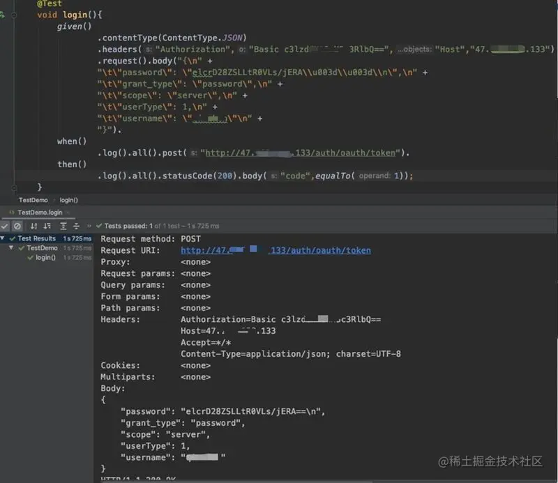 given() .when() .contentType(ContentType.JSON) .headers("Authorization","Basic c3lzxxx3RlbQ==","Host","47.xxx.xxx.133") .request().body("{\n" + "\t"password": "elcrD28ZSLLtR0VLs/jERA\u003d\u003d\n",\n" + "\t"grant_type": "password",\n" + "\t"scope": "server",\n" + "\t"userType": 1,\n" + "\t"username": "qinzhen"\n" + "}") .post("47.xxx.xxx.133/auth/oauth/…") . ..