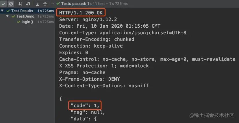 其中statusCode(200)是对状态码的断言,判断状态码是否为200; body(“code”,equalTo(1))是对返回体中的 code 进行断言,要求返回 code值为1 。