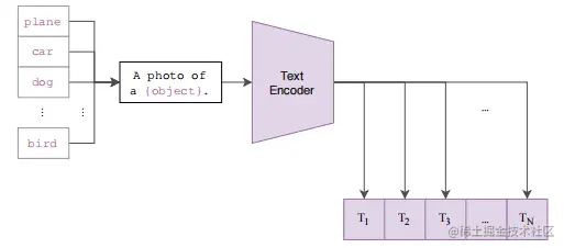 等训练好了,然后进入前向预测阶段。首先需要对文本类别进行一些处理,拿 ImageNet 数据集的 1000 个类别来说,原始的类别都是单词,而 CLIP 预训练时候的文本端出入的是个句子,这样一来为了统一就需要把单词构造成句子,怎么做呢?可以使用 A photo of a {object}. 的提示模板 (prompt template) 进行构造,比如对于 dog,就构造成 A photo of a dog.,然后再送入 Text Encoder 进行特征提取,就 ImageNet 而言就会得到一个 1000 维的特征向量,整个过程如下: