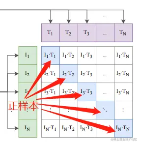 进行一些说明。在预训练阶段,对比学习十分灵活,你只需要定义好 正样本对 和 负样本对 就行了,其中能够配对的图片 - 文本对即为正样本。具体来说,先分别对图像和文本提特征,这时图像对应生成 I1、I2 ... In 的特征向量,文本对应生成 T1、T2 ... Tn 的特征向量,然后中间对角线为正样本,其余均为负样本。这样的话就形成了 n 个正样本,n^2 - n 个负样本,如下。一旦有了正负样本,模型就可以通过对比学习的方式训练起来了,完全不需要手工的标注。当然,自监督的训练需要大量的数据,OPEN AI 的这个训练数据量大约在 4亿个 的数量级。
