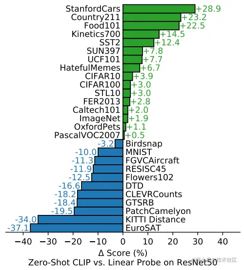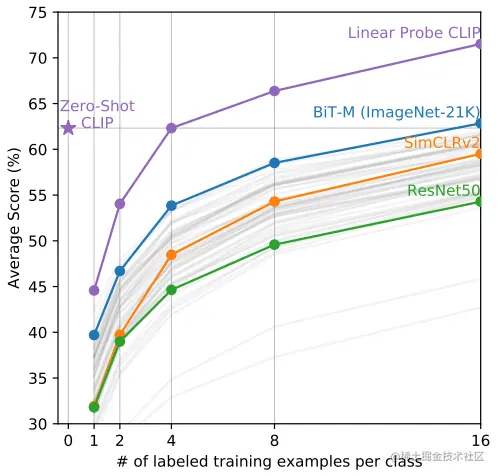 来看最重要的 Zero-Shoot / Few-Shoot 的能力,主要对比有监督的 Base 网络,涉及的迁移数据集有 27 个之多,可以看到 CLIP 的 Zero-Shoot 能力十分突出,如下。 其中 Linear Probe 的意思是指训练的时候把预训练好的模型权重冻住,直接用其提取特征,然后只是去训练最后的 fc 分类头。