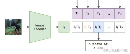最后就是推理见证效果的时候,怎么做的呢。这个时候无论你来了张什么样的图片,只要扔给 Image Encoder 进行特征提取,会生成一个一维的图片特征向量,然后拿这个图片特征和 1000 个文本特征做余弦相似度对比,最相似的即为我们想要的那个结果,比如这里应该会得到 A photo of a dog.,整个过程如下: