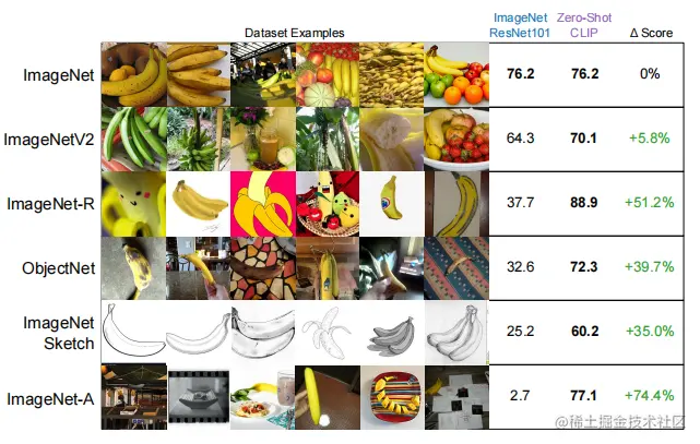 由于 CLIP 学习的是文本语义信息,而不是单类别信息,这样做的好处可以体现在迁移能力上。CLIP 不仅在 ImageNet 常规数据集上表现优秀,对于 ImageNet Sketch 素描图、ImageNet-R 动漫图等非常规图像上的迁移学习能力依旧表现的非常好,如下: