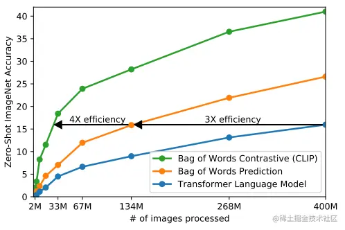 由于训练数据巨大,训练是个十分耗费时间的事情,所以必须对训练策略进行一些改进以提升训练效率。采用对比学习进行训练的一个重要原因也是考虑到 训练效率。来看图,最下面的蓝线表示像 GPT2 这种预测型的任务(预测型的任务是指,我有一张图片,去预测图片对应的描述,这个时候因为人类的语言是个奇妙又伟大的东西,一张图往往能对应出多种文本描述,比如 姚明篮球打得好 和 姚明真高,对于描述同一张图并不冲突),可以看到是最慢的。中间黄线是指一种 bag of words 的方式,不需要逐字逐句地去预测文本,文本已经抽象成特征,相应的约束也放宽了,这样做训练速度立马提高了 3 倍。接下来进一步放宽约束,不再去预测单词,而是去判断图片 - 文本对,也就是绿色的线 对比学习的方法,这样效率又可以一下提升至 4 倍。