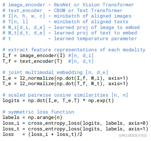 CLIP 的整个逻辑比较清晰、简单,先看下 CLIP 整体伪代码: