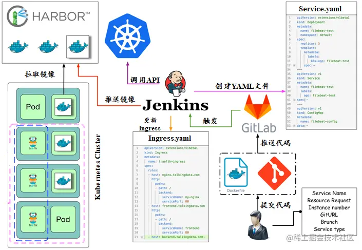该公司决定采用GitLab +Jenkins来构建CI/CD环境,以缩短新功能开发上线周期,及时满足客户的需求,实现DevOps的部分流程,来减轻部署运维的负担,实现可视化容器生命周期管理、应用发布和版本迭代更新,需要完成GitLab + Jenkins + Kubernetes的CI/CD环境部署。CI/CD应用系统架构如下: