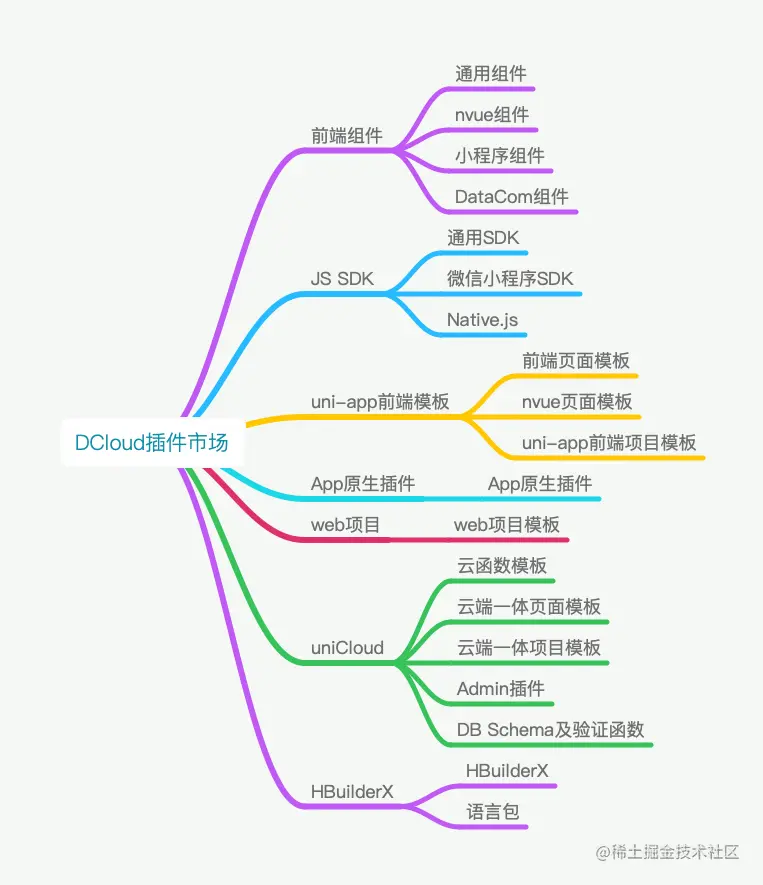 插件市场将插件分为前端组件、JS SDK、uni-app 前端模板、App 原生插件、uniCloud 等 7 大类、20 多个子类