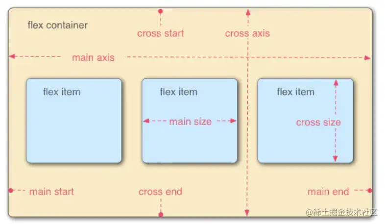 容器中默认存在两条轴,主轴和交叉轴,呈90度关系。项目默认沿主轴排列,通过flex-direction来决定主轴的方向
