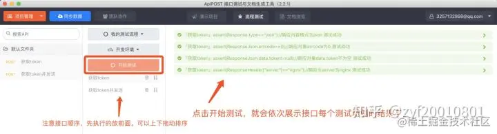 1、流程测试时,请注意每个流程里面的接口顺序,先执行的需要放在前面。例如:把登陆接口放前面,以便于后续的接口直接使用登陆接口返回的token参数。