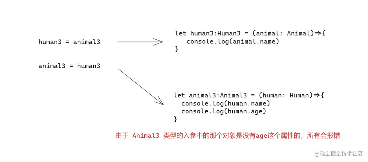 这个也很好理解,子类型中含有比父类型更多的属性,所以子类型赋值给父类型能够保证父类型需要的属性子类型全都含有,但是父类型赋值给子类型就无法保证含有子类型特有的属性,所以为了保证类型安全,这里会给出报错,报错的内容也正如我们所说,缺少 'age' 这个属性。