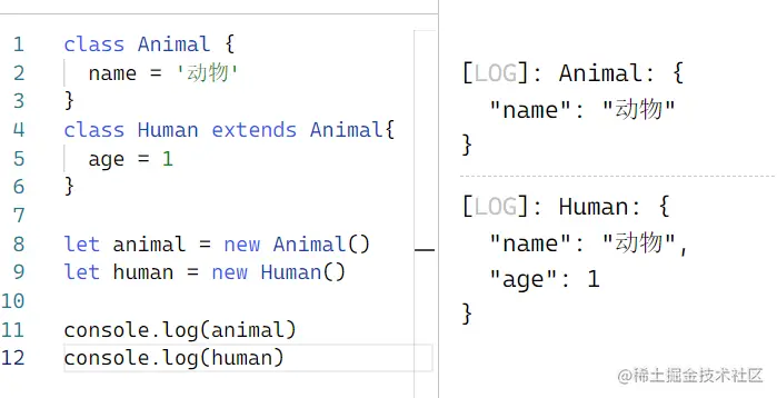 类似于这样子,我们就能够说 Human 类 是 Animal 类的子类,Human 类的实例会继承 Animal 类的属性以及方法。