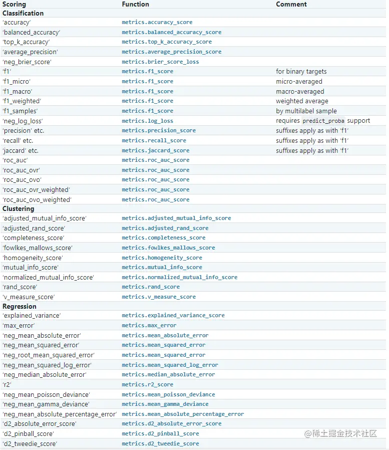 estimator这个就是一个估算器,需要验证的模型X我们的训练集y标签集groups用于分割数据为数据/测试集的标签的组标识cv交叉验证的拆分策略,本例子cv=10,也就是会分成10个子集,如果None,则会是分成5个子集n_jobs并行的jobs数量,如果设置1,表示不用并行,可用于debug,默认设置-1,则会使用所有cpu,默认None也是设置为-1verbose详细级别fit_params传给估算器的一些参数pre_dispatch用于控制多少并行期间执行的jobs数error_score如果出错会返回的值scoring选择评分验证的模式,可以点击图片下的查看scoring的所有可选参数