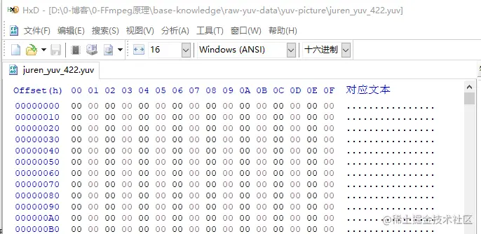 先用 HxD 来看一下 juren_yuv_444.yuv 图片 实际的存储情况,请看下图: