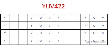 所以,422 格式,是第一第二个像素共享 一组UV,第三第四像素共享 一组 UV,以此类推,如下图: