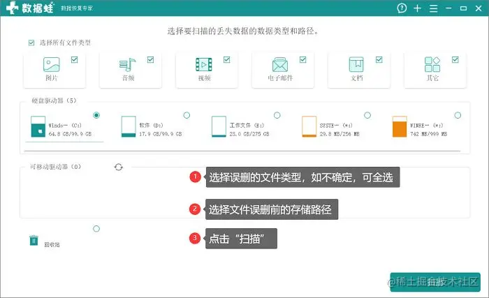 软著技术:数据恢复多项国家软著技术,更高恢复成功率保障。步骤说明:第1步:双击电脑内的数据蛙数据恢复专家运行它;第2步:在软件首页界面选择你误删的文件类型(如果不确定误删的文件数量或类型,可以全部选择),再选择删除文件之前的路径,随后点击“扫描”;
