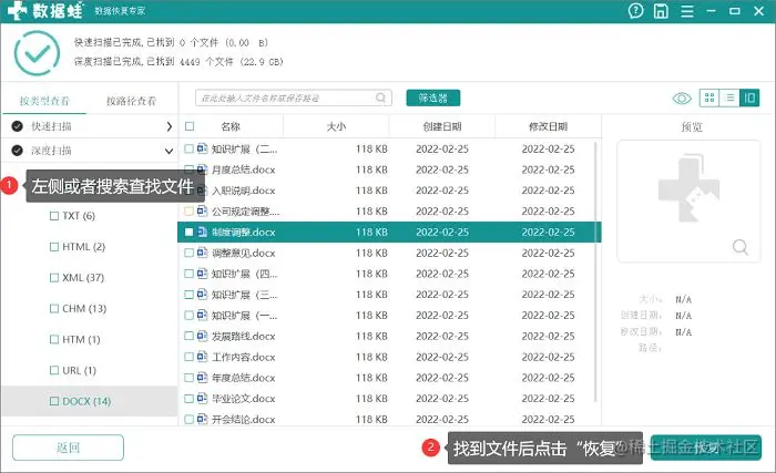 第3步:扫描结果出来,左侧就是你所扫描出来的文件,根据自己实际情况对文件类型进行查找,如果找不到还可以通过上方的搜索功能进行查找。找到自己丢失的文件后即可开始“恢复”。