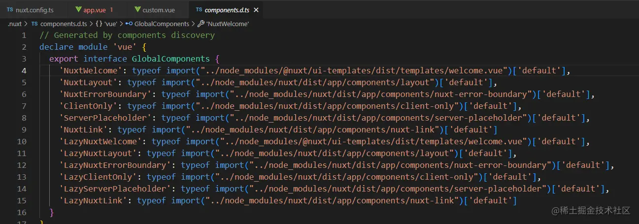 是自动引用组件的我用ctrl+鼠标左键点进了定义发现NuxtWelcome