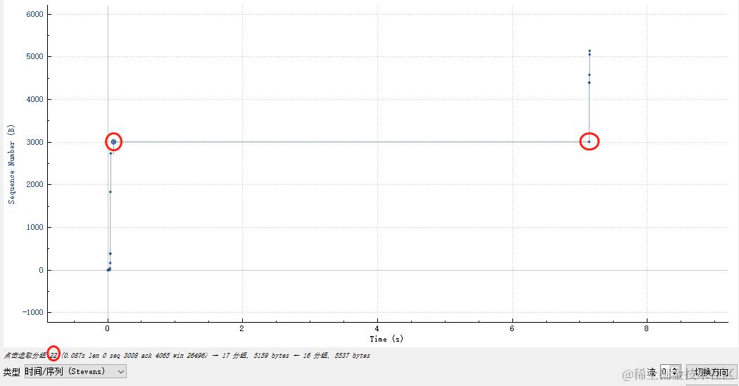 TCP流图形-时间序列(Stenves),数据包 22-23 之间的间隔,图示明显。