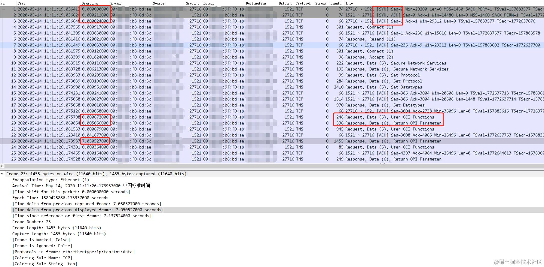 - 客户端数据包 21 (Requset) 开始,问题发生,服务端未及时 Response 数据,只是通过数据包 22 (ACK)确认了数据包 21 ,到数据包 23 响应数据,到客户端收到时已经耗时了7秒时间。