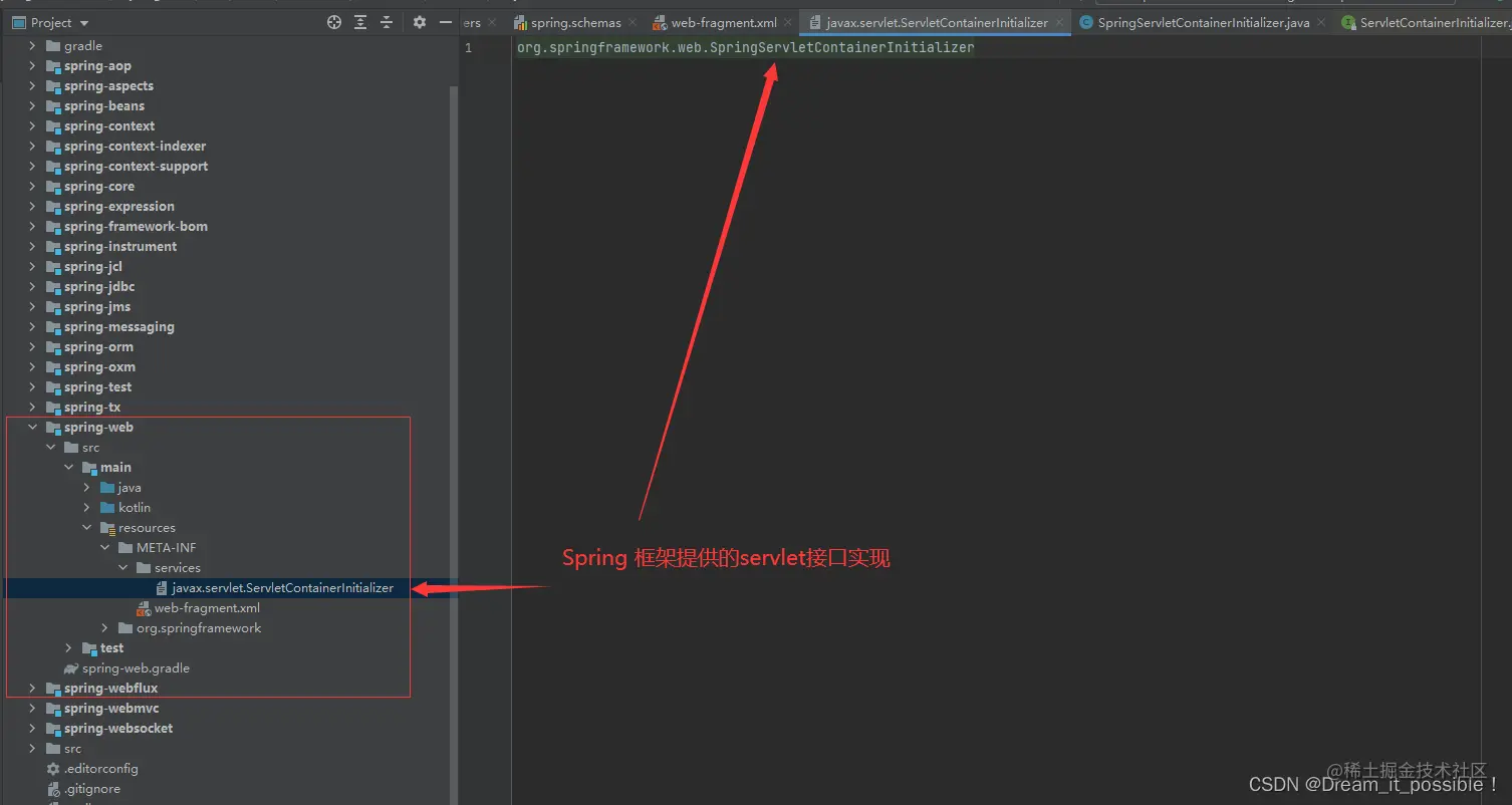 一般实现只配置一个就行,比如Spring框架里的spring-web模块,实现了servlet提供的初始化接口javax.servlet.ServletContainerInitializer,实现类为:org.springframework.web.SpringServletContainerInitializer。
