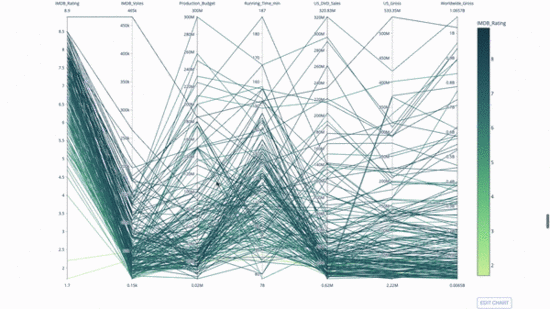 另一种探索类别变量之间关系的方法是以下这种平行坐标图。你可以随时拖放、高亮和浏览值,非常适合演示时使用。