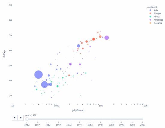在研究这个或那个指标的演变时,我们常涉及到时间数据。Plotly动画工具仅需一行代码就能让人观看数据随时间的变化情况,如下图所示: