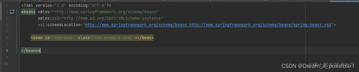 采用xml的方式配置一个bean, 定义的xml文件中需要包含beans的命名空间声明,其中 "www.springframework.org/schema/bean…" 是bean默认的命名空间地址,一定不能缺少,否则在getBean的时候会出现报错没有声明beans的问题, Spring-beans.xml文件配置如下: