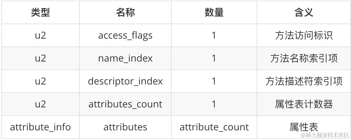 方法表中的每个方法都用一个 method_info 表示,其数据结构如下: