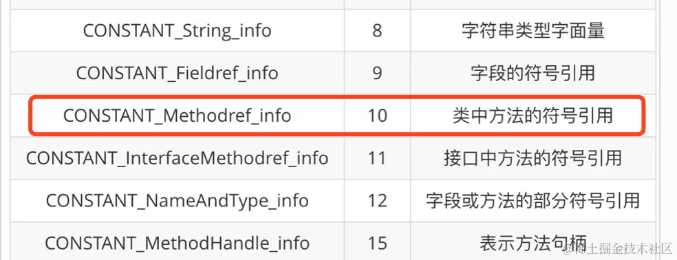 我们可以从上图知道,常量池的常量都是由cp_info这种表结构组成的,而且表结构不同其大小也不同。在 Java 虚拟机规范中一共有 14 种 cp_info 类型的表结构。