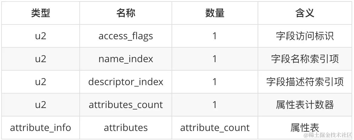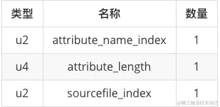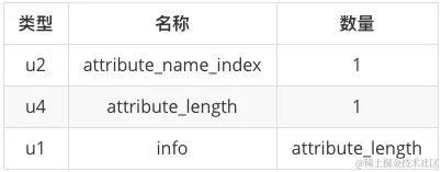 接着 2 个常量标识属性表的数量,这里数据为 00 01,表示后面有 1 个类型为 表结构为 attribute_info 的属性信息。attribute_info 表的表结构如下。