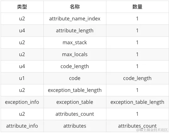 即紧接着 2 个字符表示属性名的索引项,这里数据为 00 09,即对应常量池第 9 个常量,查询可知其值为:Code。Code 属性的表结构如下图所示。