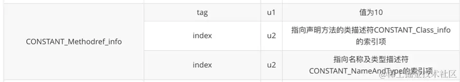 该常量项第 2 - 3 个字节,其值为 00 06,表示指向常量池第 6 个常量所表示的信息。根据后面我们分析的结果知道第 6 个常量是 java/lang/Object 。第 4 - 5 个字节,其值为 000f,表示指向常量池第 15 个常量所表示的信息,根据 javap 反编译出来的信息可知第 10 个常量是 <init>:()V。将这两者组合起来就是:java/lang/Object.<init>:V,即 Object 的 init 初始化方法。