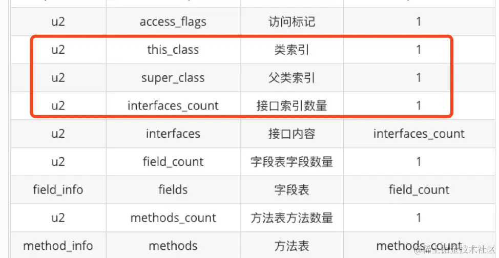类索引和父类索引都是一个u2类型的数据,而接口索引集合是一组u2类型的数据的集合,Class 文件中由这三项数据来确定这个类的继承关系。
